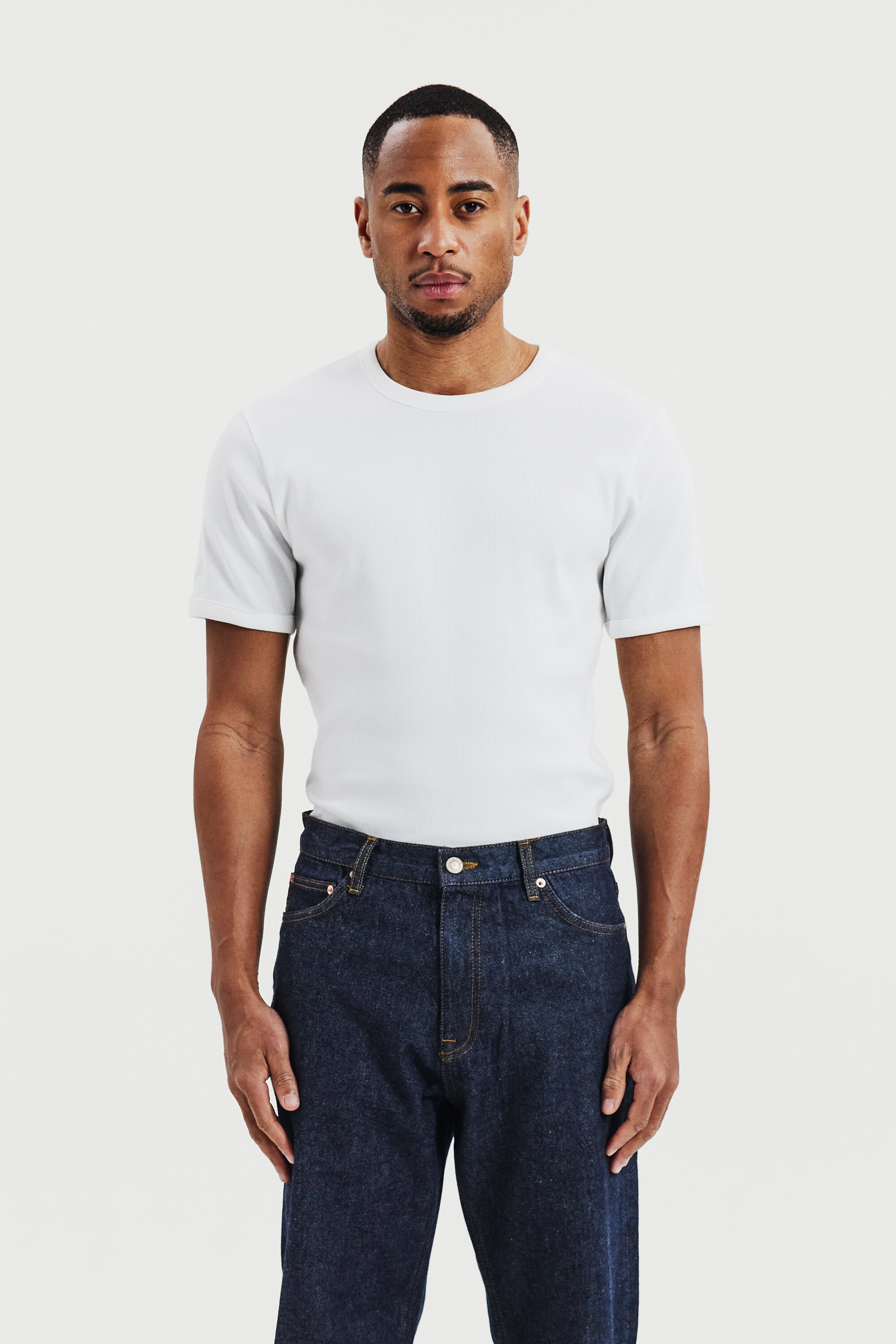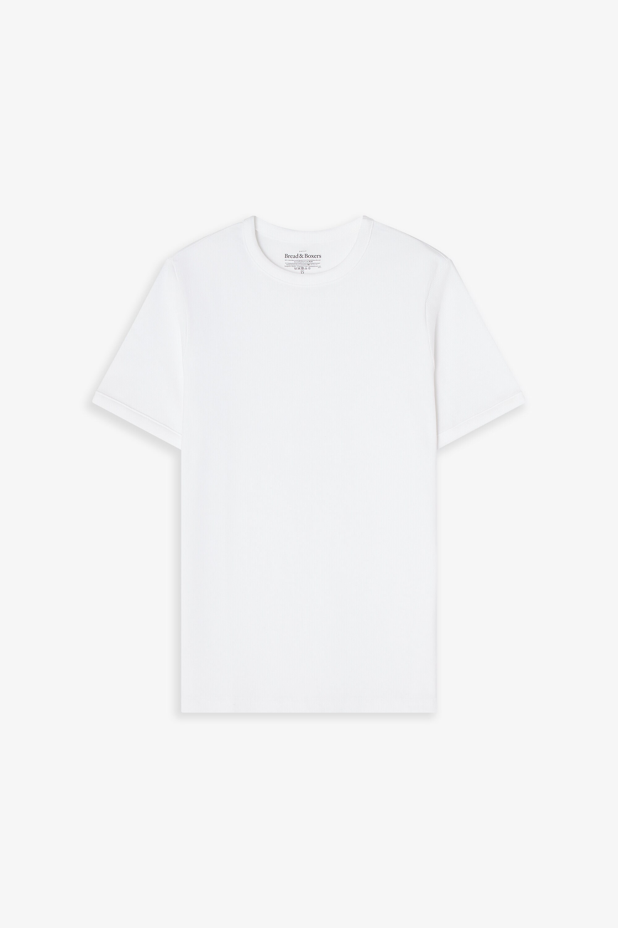 Den fine ribbestrukturen gir en subtil tekstur, mens rene kanter ved ermer og hals gir et stilrent uttrykk. Fargen hvit gjør T-skjorten til et allsidig basisplagg.