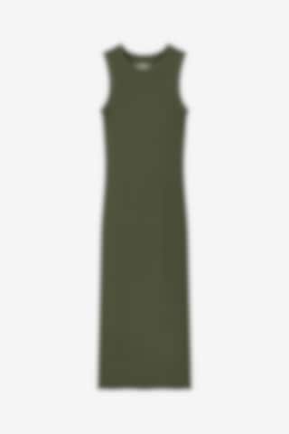 Ribbestrikket kjole med høy krage. Kjolen er laget av en økologisk bomullsblanding for en varig, kroppsnær passform. Det perfekte sommerplagget når du vil kle deg enkelt og elegant. Bruk den alene eller suppler med en skjorte for en mer pyntet stil.
