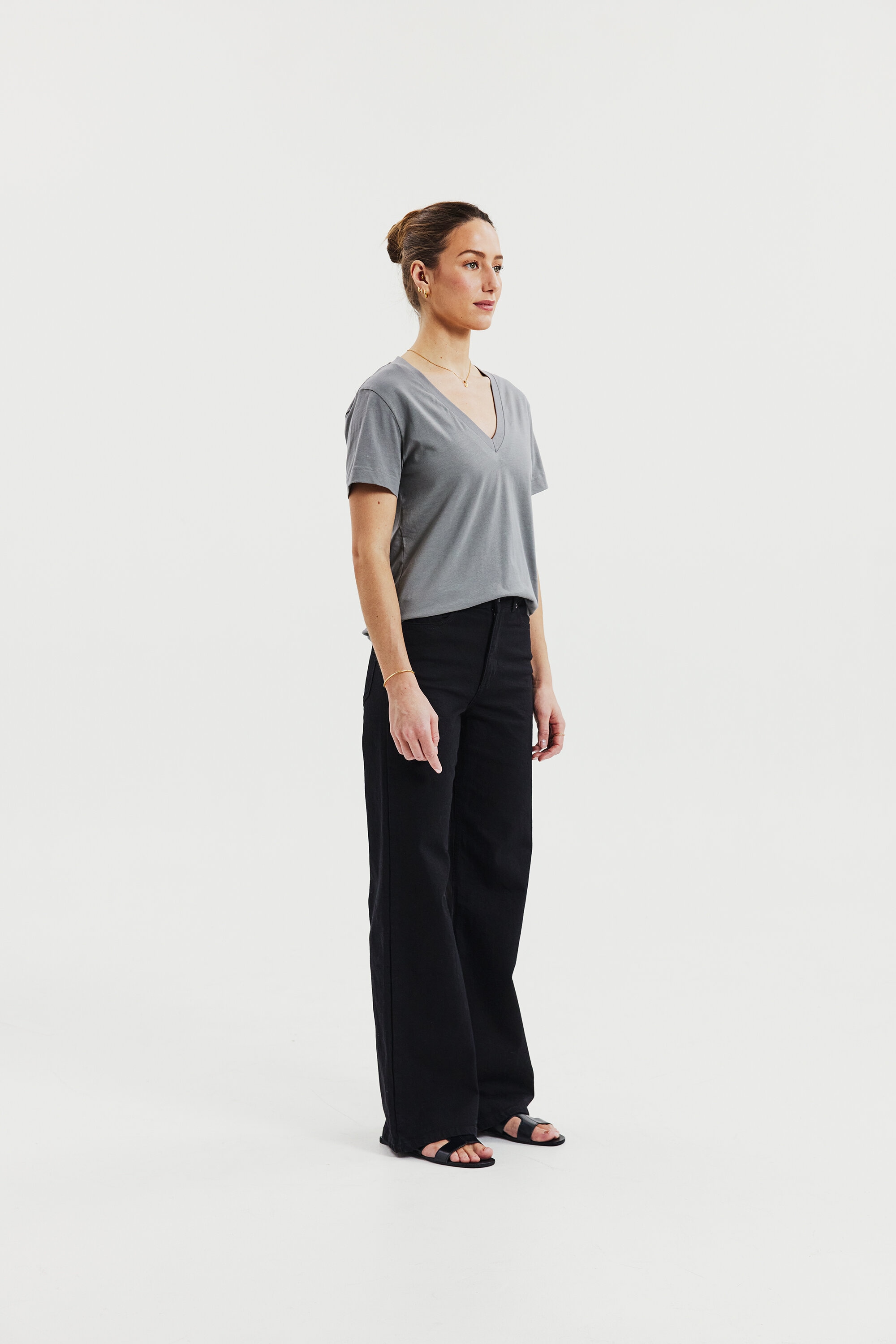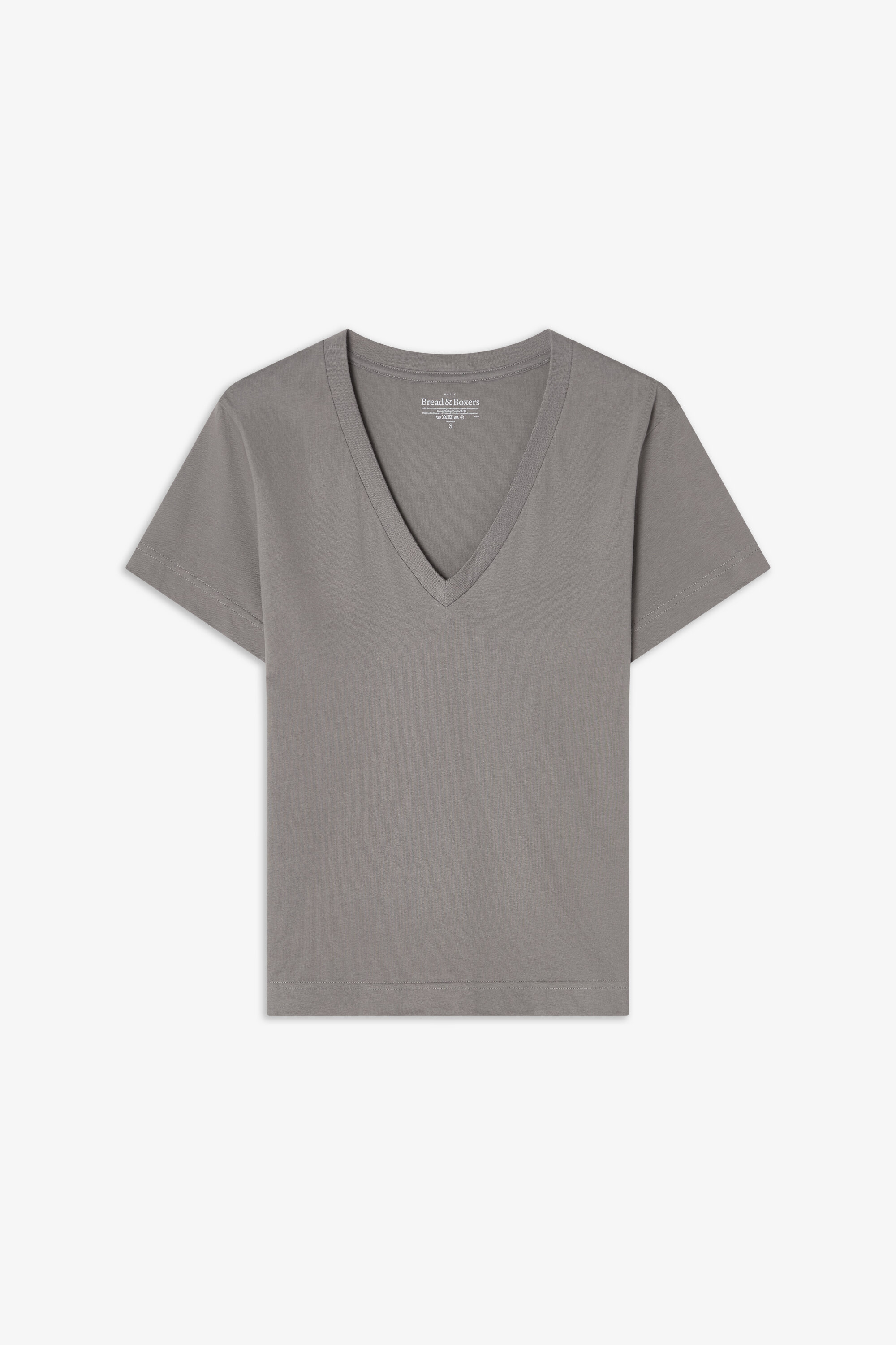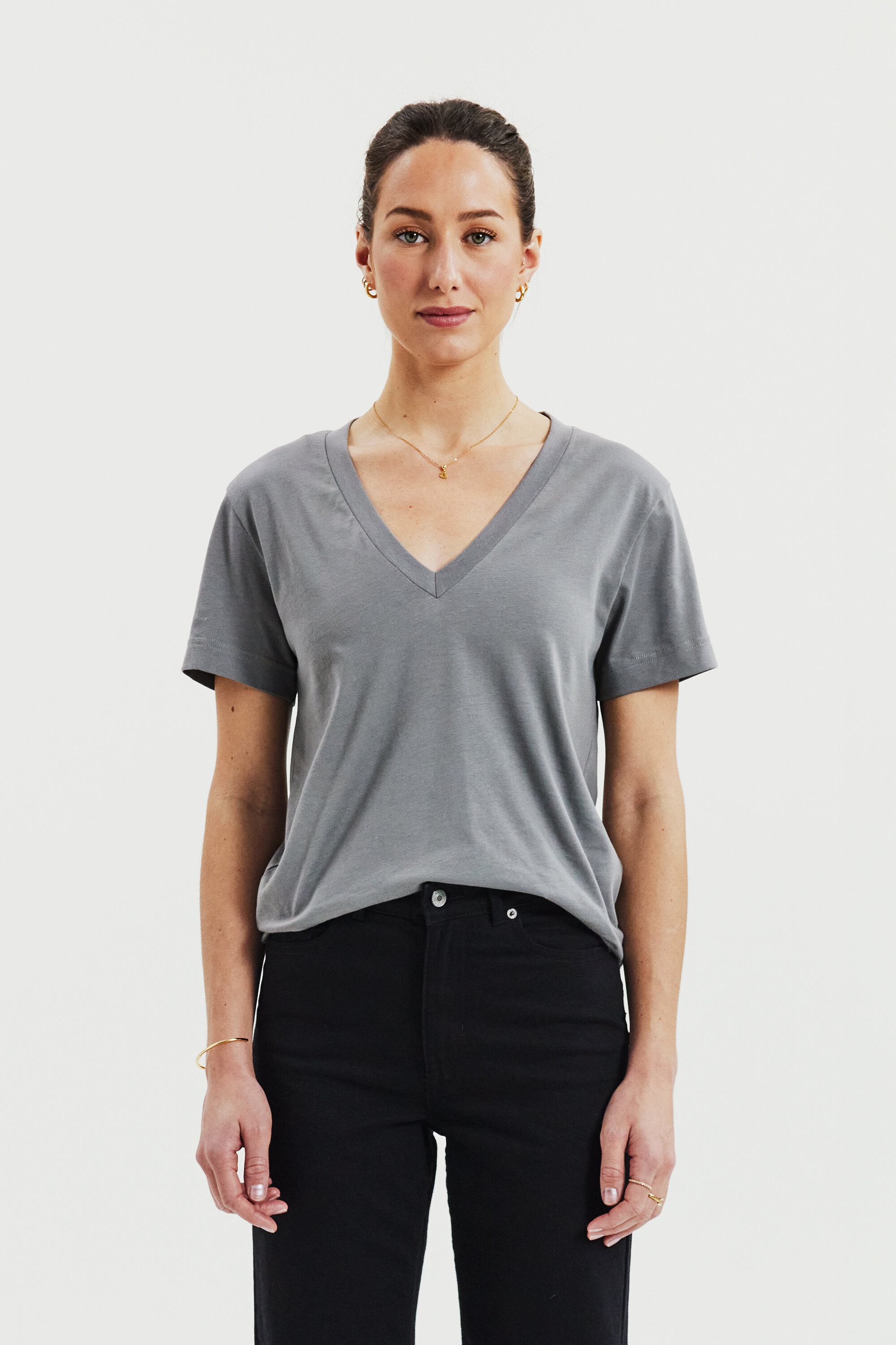 En moderne klassiker med en boxy passform, laget av tett og myk økologisk bomullsjersey. Designet for en regular fit med en romslig V-hals og avsluttet med presise toppsømmer – et tidløst basisplagg for enhver garderobe.